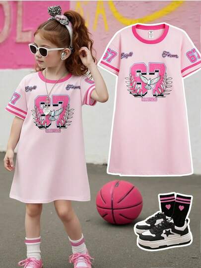 SHEIN 年轻女孩夏季休闲时尚街头运动风数字印花撞色包边短袖T恤裙 - 粉色 - 查看 1