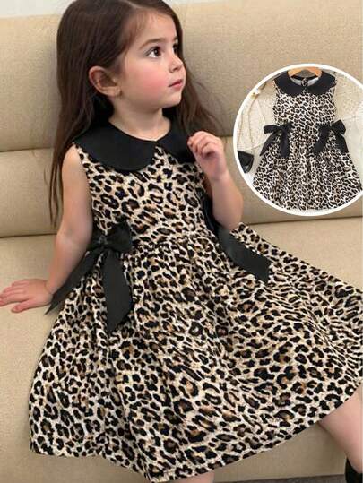 SHEIN 少女时尚夏季豹纹蝴蝶结领A字公主裙,豹纹连衣裙,优雅、可爱、休闲,适合外出、街头穿搭、节日及各种场合。 - 彩色 - 查看 1