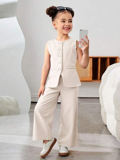 SHEIN 年轻女孩通勤休闲纯色梭织无袖圆领上衣和直筒裤套装,法式 - 杏色 - 查看 1