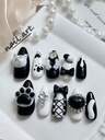 1 片手工制作的按压式美甲贴片,椭圆形,黑白甜美酷炫风格 3D 美甲贴片,可爱美甲,假指甲贴片,长款美甲贴片,高端美甲贴片,可重复使用,适合女性和女孩日常或度假佩戴,也可作为礼物赠送。