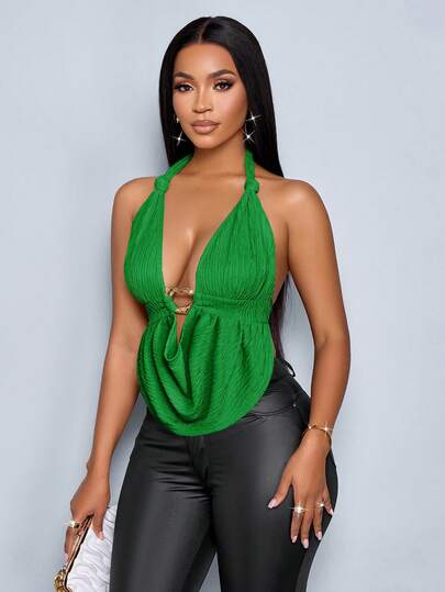 SOLERSUN 春夏女装休闲度假杏色深V领露背吊带衫,前中金属扣,肩带收拢,扭结弧形下摆,露背针织纹理面料吊带背心 - 綠色 - 查看 5
