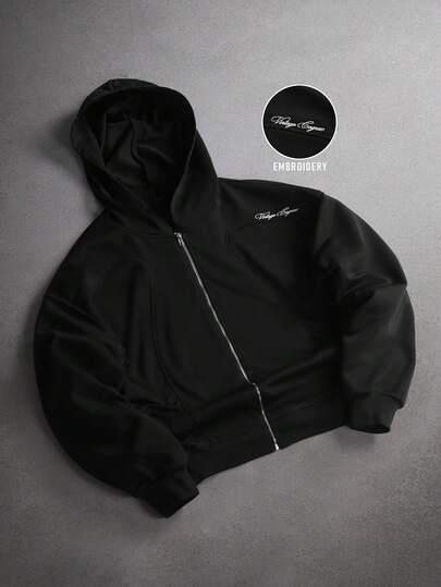 STYNVO 男士字母刺绣拉链休闲百搭连帽衫 - 黑色 - 查看 1