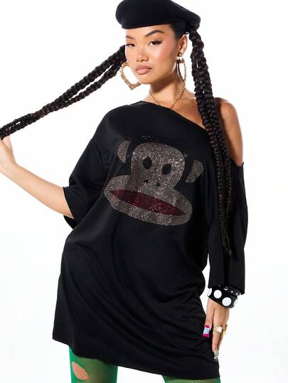 SUMWON X PAUL FRANK SUMWON WOMEN 露肩水钻装饰图案迷你T恤连衣裙,蝙蝠袖设计,宽松版型,适合休闲派对穿着 - 黑色 - 查看 1