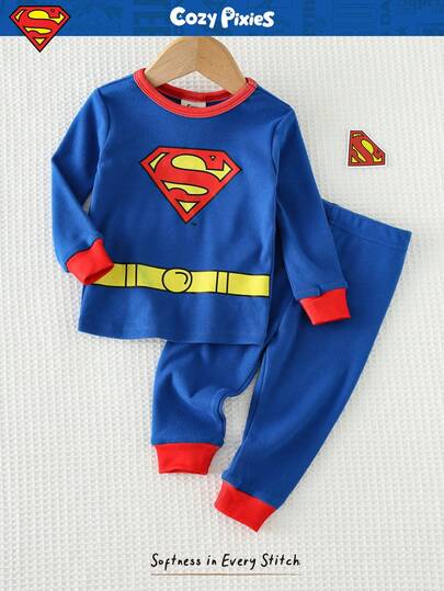 SUPERMAN X Cozy Pixies 两件套男婴贴身睡衣套装,柔软针织圆领长袖上衣和弹性腰长裤,印有超级英雄图案。 - 藍色 - 查看 1