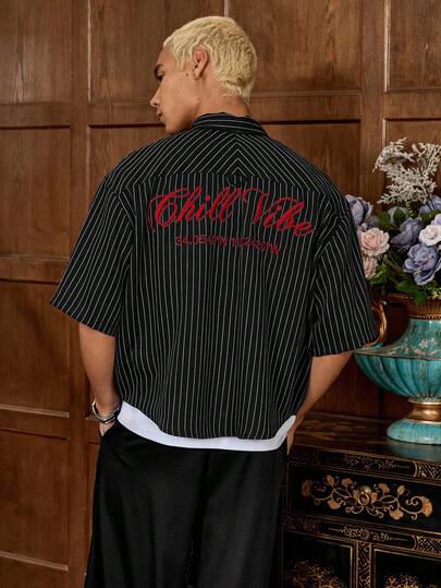 SWAVVY 标准尺码男士休闲蓝白条纹短袖宽松衬衫,饰有花卉英文刺绣