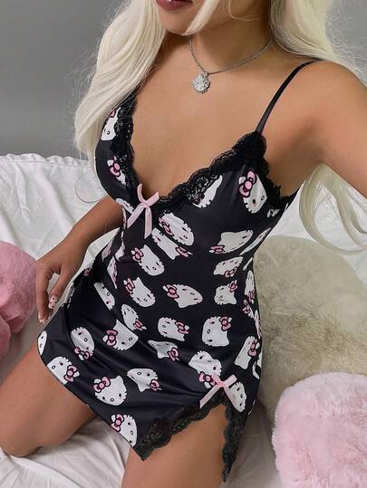 Sanrio 1件Hello Kitty情人节女士深V领撞色蕾丝开衩睡裙+丁字裤 - 黑色 - 查看 1
