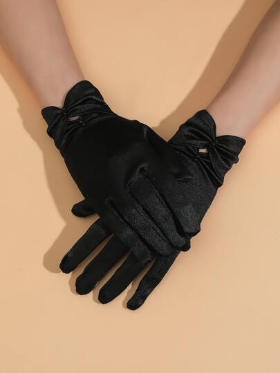 緞面珠飾手套帶蝴蝶結 - 黑色 - 查看 1