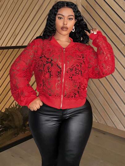 Slaydiva 日常休闲优雅紧身纯红色长袖透明蕾丝夹克,短款拉链大码女士,春秋季 - 紅色 - 查看 1