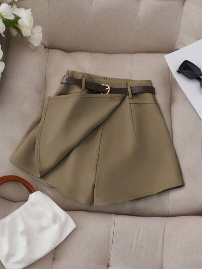 SHEIN PETITE 法式简约纯色假口袋短裙短裤配腰带,舒适休闲女士短裤,夏季 - 摩卡棕 - 查看 1