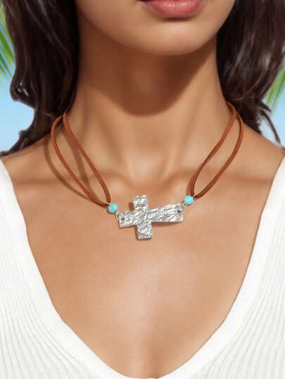 1 件串珠和十字架装饰双层棕色皮革颈链女士西部饰品 - 棕色 - 查看 1