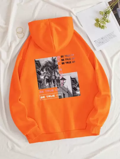 INAWLY 雕塑和字母圖案加絨內裏抽繩連帽衫 - 橘色 - 查看 1