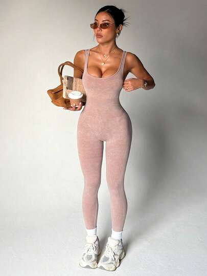 Seamluxe SHEIN Sport 无袖无缝高弹瑜伽健身连体衣 - 卡其色 - 查看 1