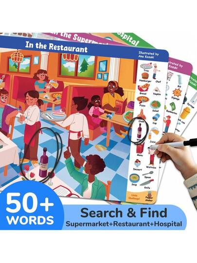 为儿童和幼儿搜索并找到相同的活动卡,学龄前学习活动卡可重复使用,配有 1 支干擦记号笔,3 个主题“超市+餐厅+医院”益智玩具,公路旅行汽车飞机旅行游戏,适合幼儿的大脑发育,锻炼注意力和观察能力 - 彩色 - 查看 1