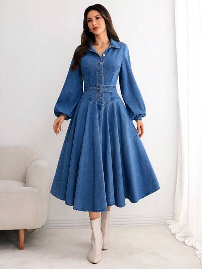 Selianne 女士优雅休闲牛仔连衣裙 - 藍色 - 查看 1