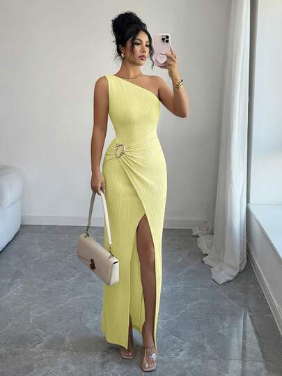 Selianne 新款时尚女士纯色性感不对称肩部扭结褶皱长裙,不对称领口针织纹理修身款式,扭结开衩设计鸡尾酒会礼服,优雅女士服饰,春夏度假、派对、情人节连衣裙