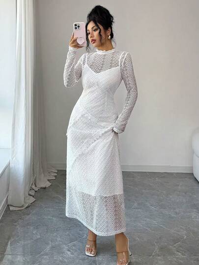 Selianne 女士秋季新款法式优雅蕾丝边拼接二合一长袖连衣裙 - 白色 - 查看 8