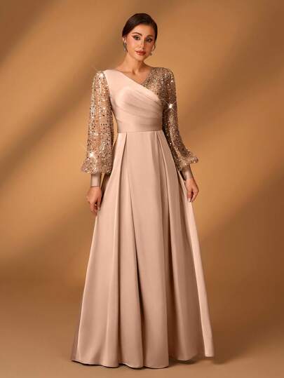 Serin 女士优雅奢华闪亮串珠亮片拼接缎面灯笼袖重叠 V 领褶皱 A 字下摆礼服,适合妈妈参加婚礼、活动、派对、晚会 - 香檳色 - 查看 1
