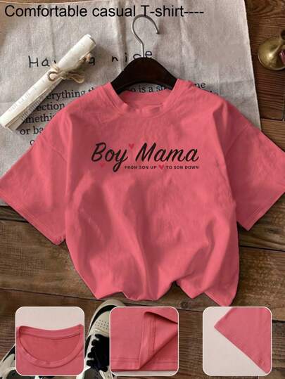 Letter Printed T-Shirt, Short Sleeved Round Neck Casual Top, Spring And Summer Casual Women's Clothing - 酒紅色 - 查看 1