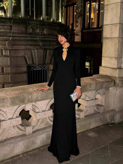 性感优雅 - 纯色缎面镂空金属装饰长袖连衣裙,音乐节派对礼服,晚宴正式礼服,圣诞派对礼服 - 黑色 - 查看 1