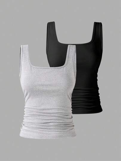 Sparklyn 2 件套青少年/少女百搭纯色方领褶皱修身短款背心,夏季经典黑白 - 彩色 - 查看 2