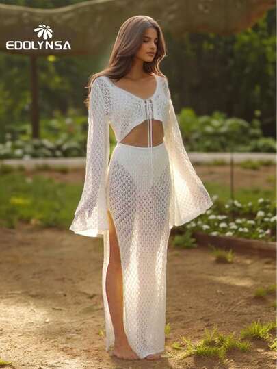 性感针织白色镂空两件套2025女夏喇叭袖系带宽松上衣沙滩度假半裙两件套 - 白色 - 查看 1