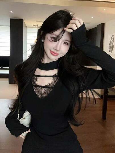 性感V领蕾丝边长袖修身镂空衬衫 - 黑色 - 查看 1