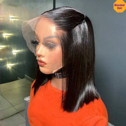 女士短款波波头假发,13x4透明蕾丝前假发,逼真发际线,180%密度,耐热合成纤维混纺真人发,自然黑色,骨白色直发,8英寸-34英寸 - 自然色&黑色系 - 查看 1