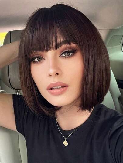 女士啡色短髮假髮,短假髮帶劉海,防高溫合成纖維假髮,適用於日常或派對使用 - 紫紅色 - 查看 1
