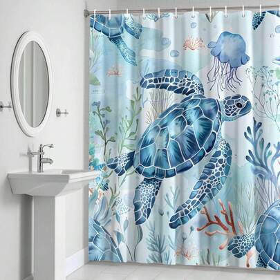 浴室浴帘,卡通海龟蓝色珊瑚水母防水浴帘,带孔眼和挂钩,海洋生物主题,可水洗,适用于酒店装饰 - A - 查看 1