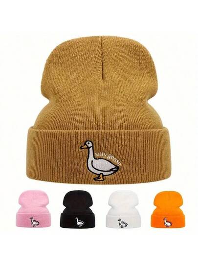 Silly Goose 男士冬季无檐便帽 - 温暖针织卡通鹅图案,高弹力 PVC 涂层面料,适合寒冷天气的休闲运动户外帽(黑色),冬季针织帽,弹力头饰,圣诞礼物 - 彩色 - 查看 1