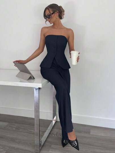 Siren Gaze 女士吊带西装套装,秋冬办公室商务装 - 藏蓝色 - 查看 2