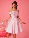 优雅的白色露肩 A 字形派对礼服,适合年轻女性的端庄正式礼服,带有甜美设计的婚礼和舞会礼服,鸡尾酒会礼服,返校节短款礼服