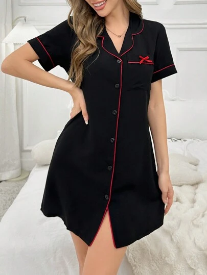 Snug Zone 撞色边饰蝴蝶结装饰贴袋翻领纽扣女士睡裙睡衣裙 - 黑色 - 查看 1