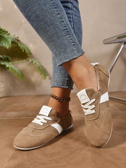 女式软底复古休闲芭蕾平底鞋,系带百搭一脚蹬,适合搭配连衣裙、简约运动鞋 - 卡其色 - 查看 1