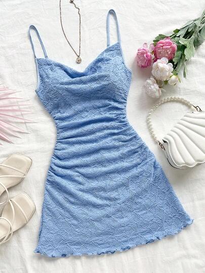 Soleia 淡黄色女士迷你太阳裙,荷叶边领口,露背设计,适合节日、约会、下午茶、度假、音乐节、波西米亚风格 - 藍色 - 查看 6