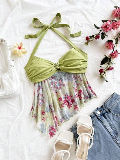 Soleia 女士休闲褶皱不对称下摆蝴蝶结露背上衣,适合夏季/春季