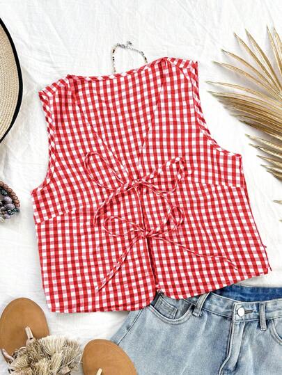 Soleia 女士休闲度假红白格子无袖前系带露背上衣,适合夏季、度假 - 彩色 - 查看 1