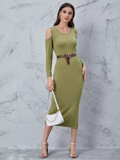SHEIN Unity 素色挖肩下擺開叉不附腰帶毛衣洋裝 - 橄欖綠 - 查看 1