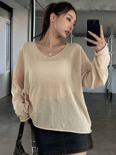 DAZY 女士纯色宽松薄款长袖毛衣,透明,秋季服装 - 杏色 - 查看 9