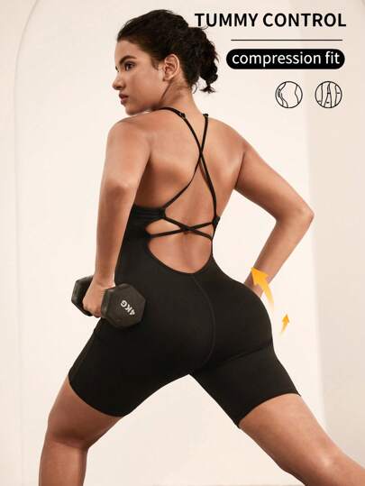 Hanevo 纯色露背无袖瑜伽运动无缝连体衣 - 黑色 - 查看 1