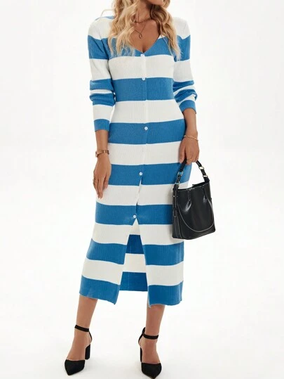 Chiquease 秋季女士纯色超大 U 领优雅秋千连衣裙 - 藍色 - 查看 6