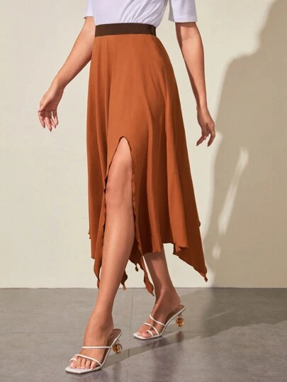 SHEIN Clasi 素色撞色腰部手帕開衩大腿半身裙 - 棕色 - 查看 1