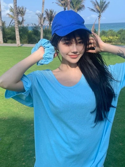 素色落肩T恤帶大腸髮圈 - 淺藍色 - 查看 1