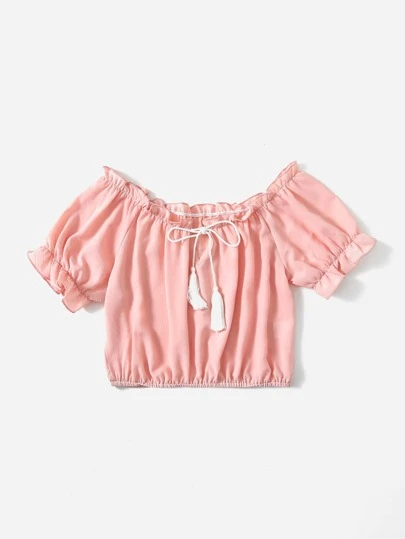 6. 素色木耳褶皺邊繫帶領流蘇襯衫