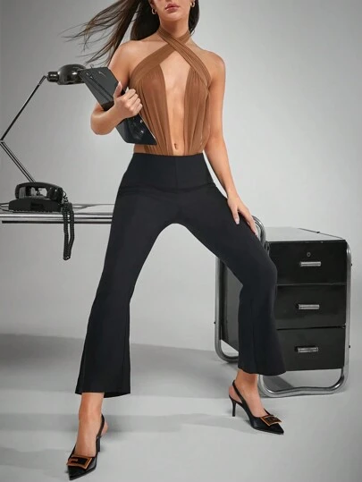 SHEIN Unity 纯色高腰开衩下摆七分喇叭裤 - 黑色 - 查看 1