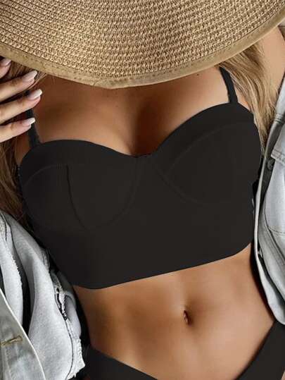 素色提臀比基尼泳裝上衣 - 黑色 - 查看 1