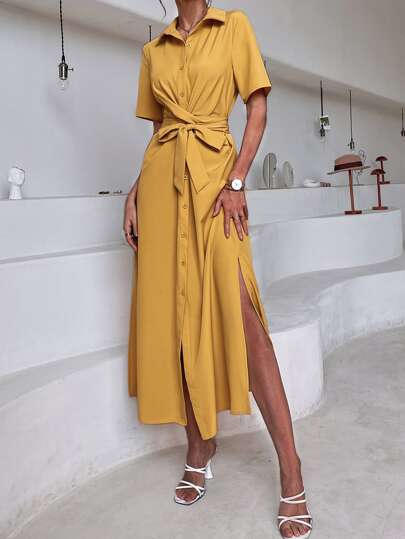 素色高衩前紐扣襯衫洋裝 - 黃色 - 查看 6
