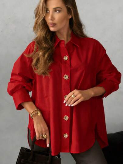 Solstice Apparel 向日葵金属扣装饰宽松长袖纯色纹理衬衫,简约奢华风格,适合日常外出、工作、约会,春夏百搭上衣 - 紅色 - 查看 1