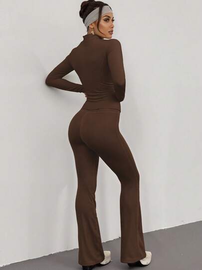 Soyun 女士秋冬瑜伽上衣和喇叭裤,休闲家居服和健身日常服 - 咖啡棕 - 查看 1