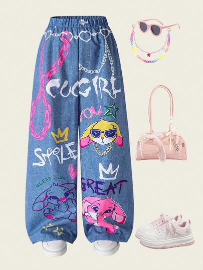 Sparklyn 休闲时尚卡通印花仿牛仔弹力腰阔腿裤,适合青少年女孩,宽松舒适,适合秋季、春季、夏季日常穿着、通勤、户外活动、篮球、足球、上学、街头风、派对、拍照等场合。